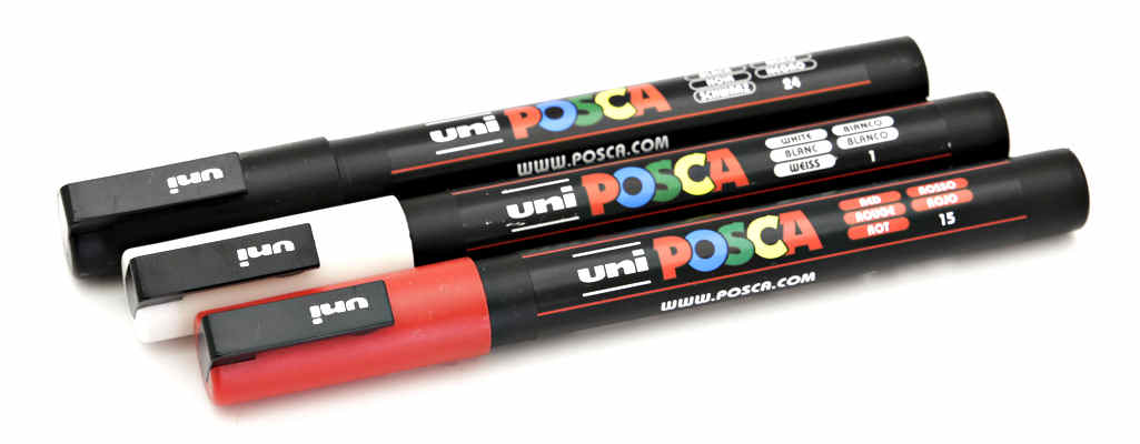 Depois de muitas tentativas de descobrir uma forma de restauração da visibilidade das escalas que resistisse a posteriores limpezas do corpo das objetivas, acabei me deparando com um marcador bastante incomum chamado Uni Posca, que é fabricado pela Mitsubishi Pencil Co. Ltd. para uso em aplicações artísticas e trabalhos artesanais (veja em www.posca.com). Esse marcador se mostrou bastante adequado para esse tipo de restauração, pois sua tinta é aplicada em forma líquida e consegue penetrar nos sulcos dos caracteres, permanacendo lá após sua secagem quando o excesso da aplicação é retirado com o uso de um pano macio e seco. Duas aplicações são suficientes para trazer de volta a visibilidade das escalas, já melhorando muito a aparência do corpo da objetiva. Aí está uma foto das milagrosas "canetinhas".