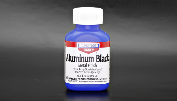 Procurei um pouco e descobri que o produto já estava à venda aqui no Brasil, inclusive no Mercado Livre, então não perdi tempo e comprei um frasco para experimentar. Fiquei surpreso com o resultado de seu uso, que além de ser rápido é extremamente simples se comparado à anodização tradicional. Veja abaixo a foto da embalagem desse anodizador chamado Aluminium Black que é fabricado pela Birchwood Casey.