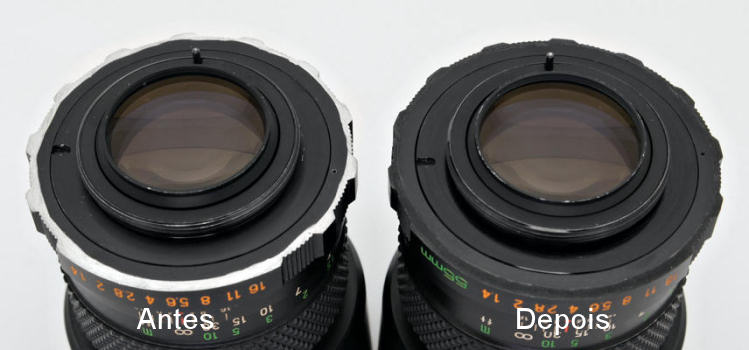 Essa anodização também pode ser usada para reparar pequenos arranhões na superfície externa do corpo das objetivas, mas apenas quando aplicadas em áreas pequenas. Apenas alerto que esse produto gera gases tóxicos quando reage sobre a superfície de alumínio, exalando um cheiro bem desagradável, então deve-se ter o cuidado de realizar sua aplicação sempre em locais ventilados.