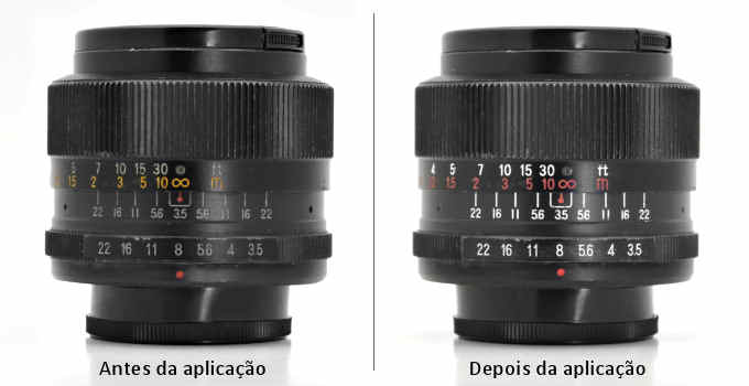 Para que você tenha uma ideia do resultado, mostro abaixo duas imagens de uma objetiva Auto Paragon 35mm f/3.5 com mais de 40 anos de uso, que teve as inscrições no corpo restauradas com os marcadores Uni Posca.
