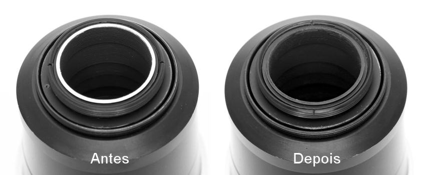 Essa anodização também pode ser usada para reparar pequenos arranhões na superfície externa do corpo das objetivas, mas apenas quando aplicadas em áreas pequenas. Apenas alerto que esse produto gera gases tóxicos quando reage sobre a superfície de alumínio, exalando um cheiro bem desagradável, então deve-se ter o cuidado de realizar sua aplicação sempre em locais ventilados.
