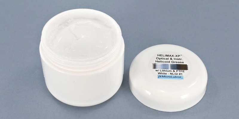 Eu costumo usar a graxa Helimax-XP, que torna a lubrificação eficaz por muito tempo, desde que aplicada nos helicoides após uma limpeza adequada, com a remoção de todos os resíduos de graxa e sujeira dos sulcos das roscas de ambos os lados. Essa graxa é feita exclusivamente para uso em helicoides e instrumentos óticos. Ela tem base sintética, tolerância a altas temperaturas, praticamente nenhum odor e não está sujeita a endurecimento precoce. Na foto abaixo mostro o pequeno pote que pode ser encontrado no Ebay.